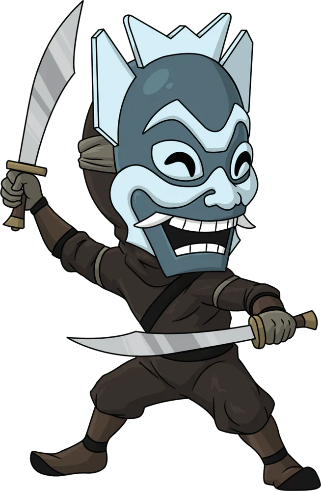 At 4.8 inches, the Blue Spirit arrives at Youtooz. He is dressed in a brown long-sleeved shirt and matching pants. Both of its arms are posed in a defensive position as they both wield sharp swords. Covering his face is a blue mask that is attached to his head with 3 straps attached behind him. The smile on the mask features a full set of teeth with two sharp fangs sticking out. The exterior of its double-walled packaging shows a beautifully illustrated nighttime scene, with Blue Spirit's silhouette in motion. The protective sleeve is a design of the 4 elements.