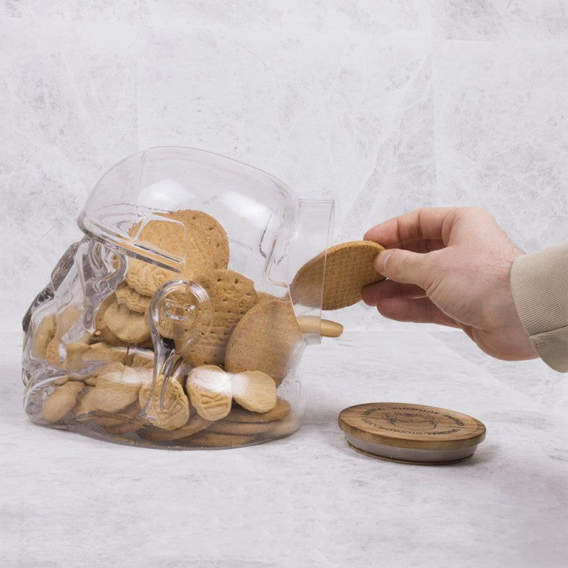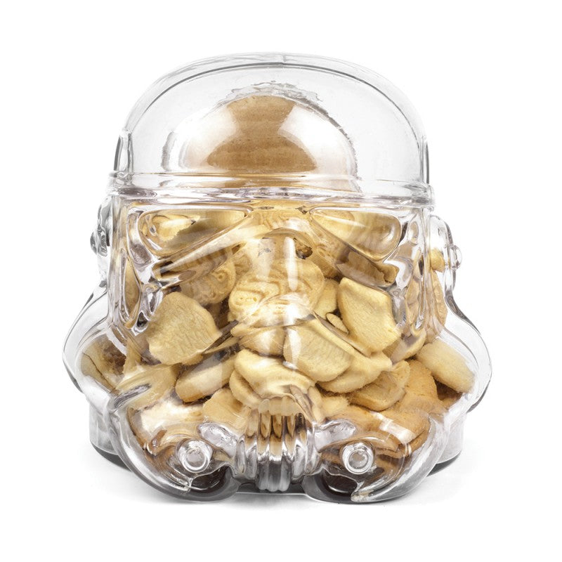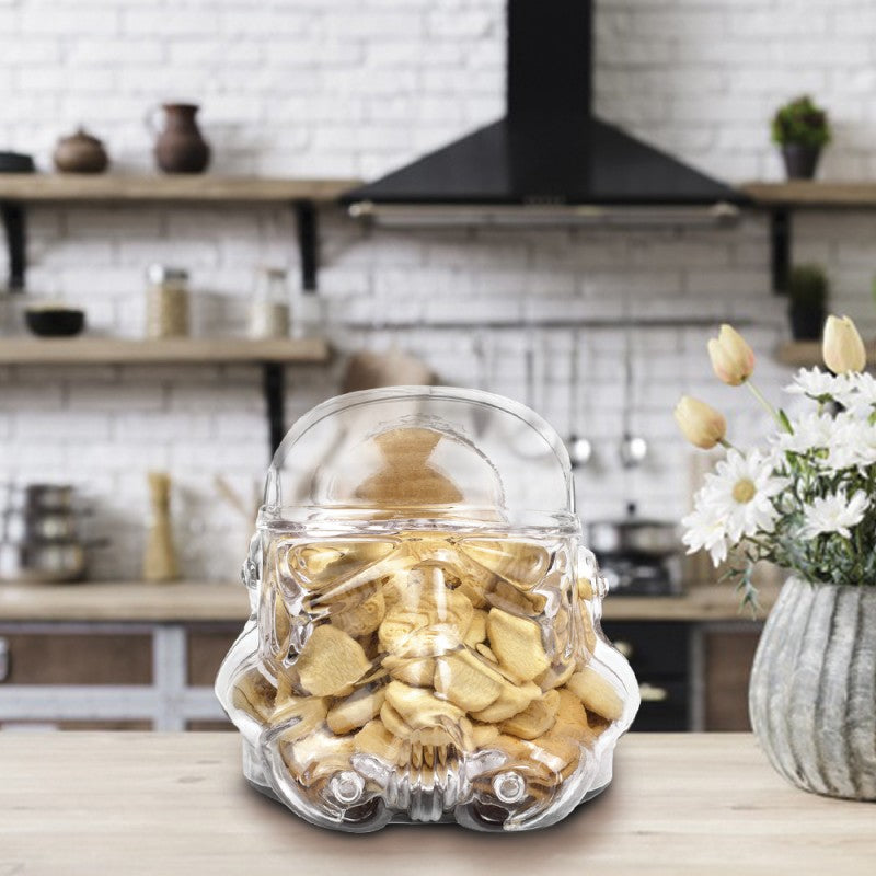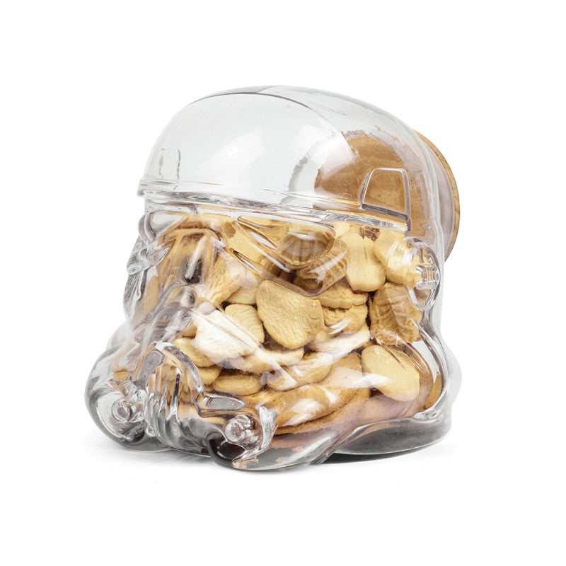 This glass cake box features a 3D Stormtrooper helmet design. It has a removable lid with a rubber seal to keep cookies fresh. Officially licensed by Star Wars .