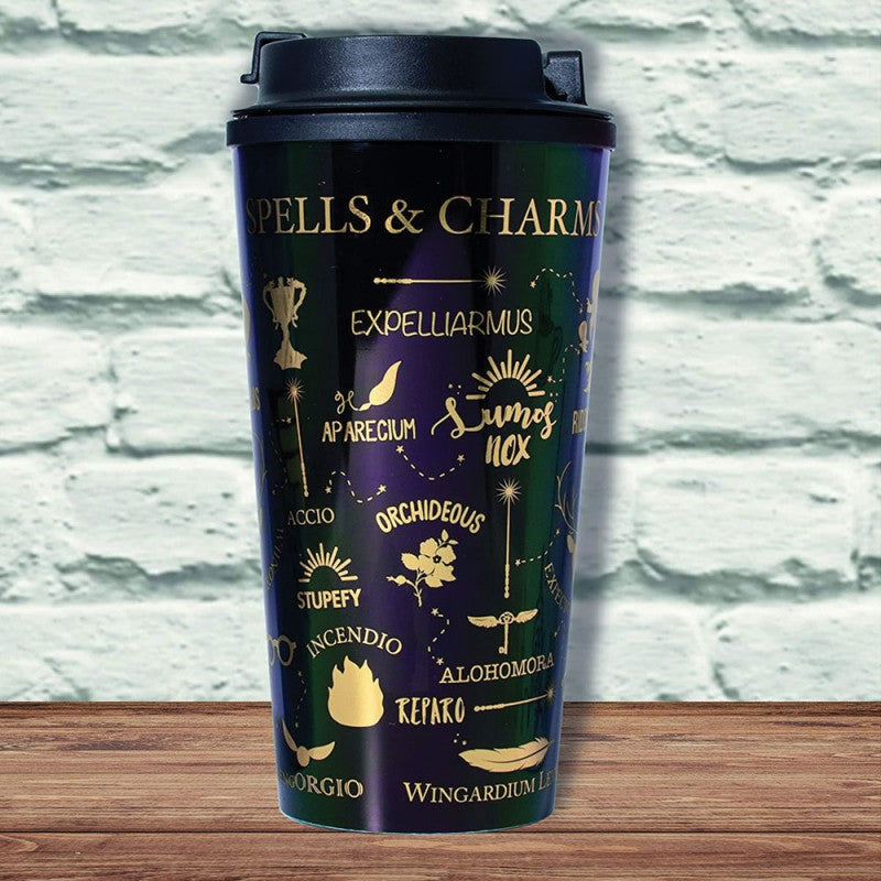 A SPELLS & CHARMS TRAVEL MUG FOR HARRY POTTER FANS.