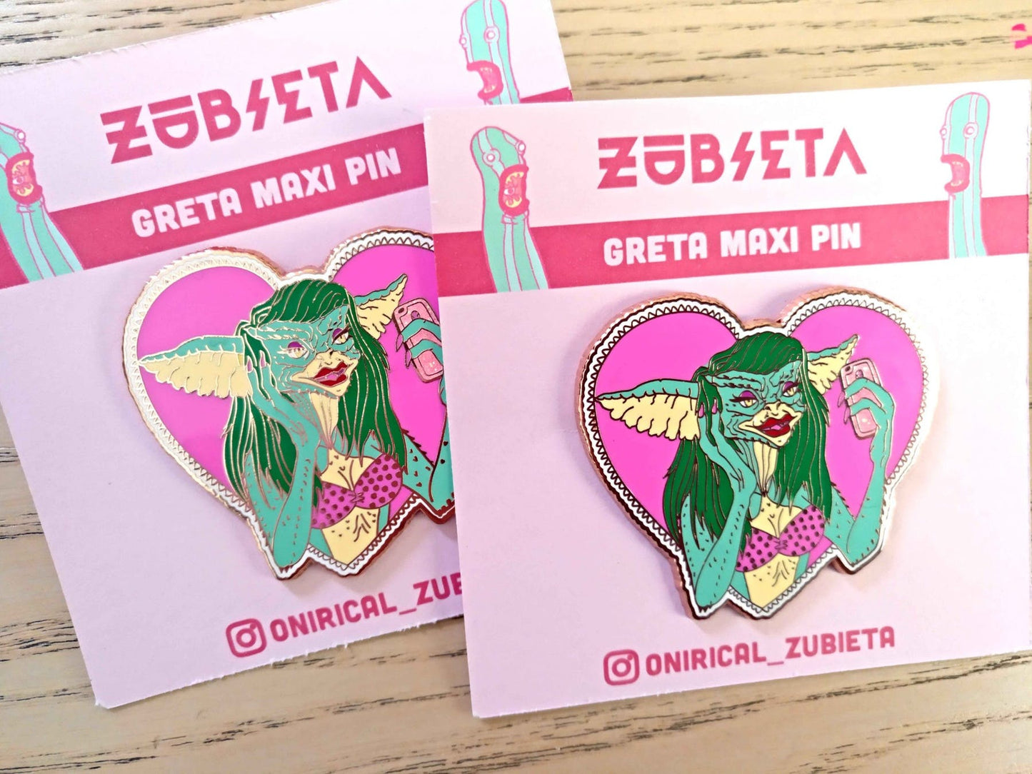 It measures 5cm wide and is made of rose gold metal and 6 enamel colors, one of which sparkles (the phone)!