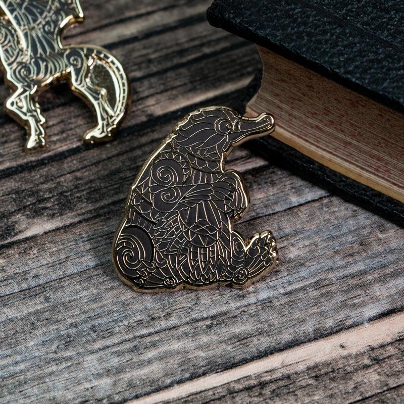 - Two premium hard enamel metal pins with a glossy finish featuring Niffler and Thestral designs on a backing card.