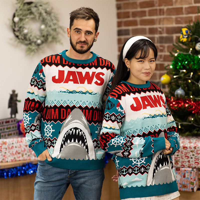 Da dum… da dum… what’s that looming over there? Is that Santa Claus coming down the chimney? Or is it a killer shark looking for its next prey? We’d rather have first choice, but that might not be the case this time. This premium 100% knitted Christmas jumper features the iconic Jaws movie poster artwork alongside little extra festive decorations dotted throughout.