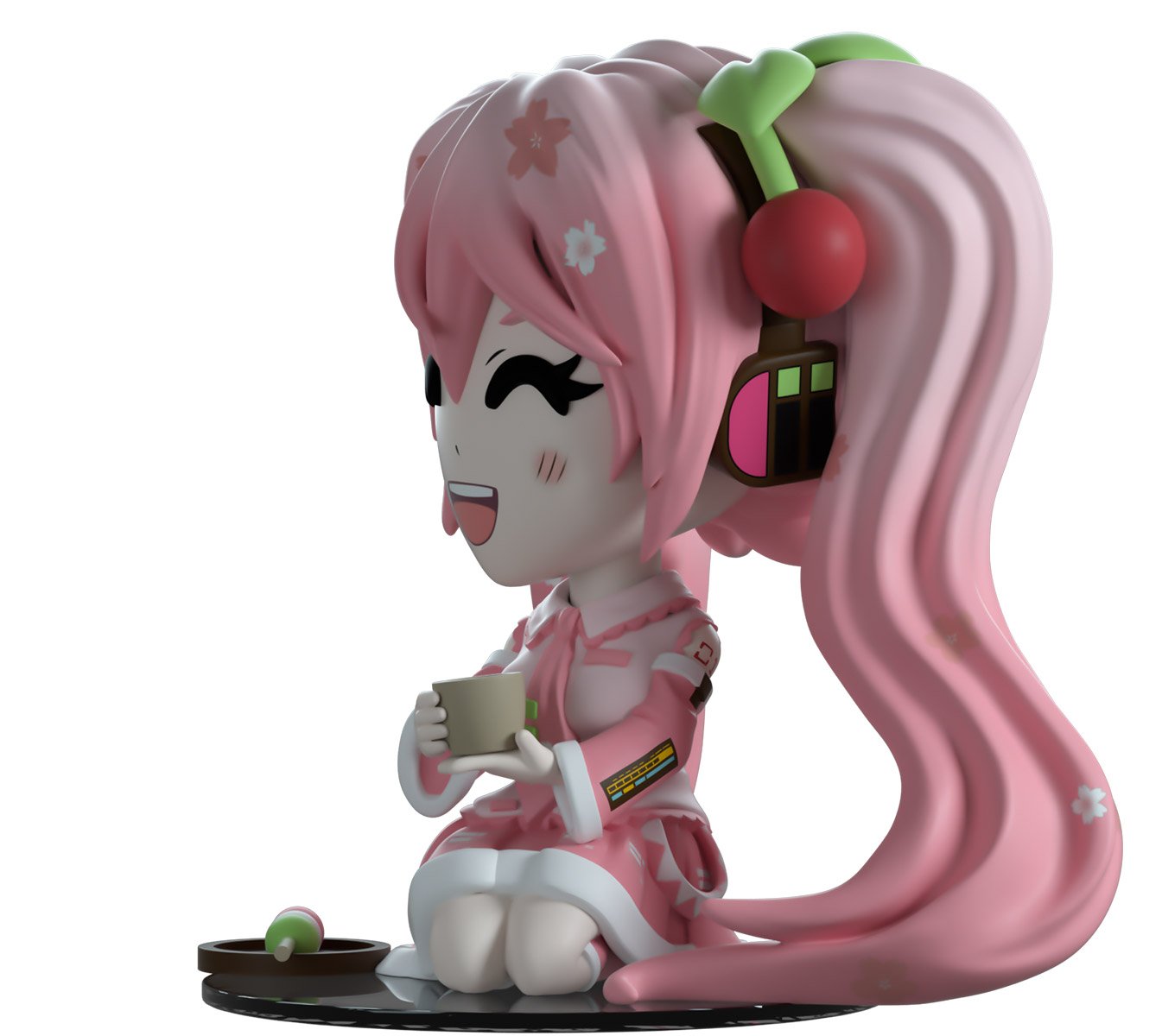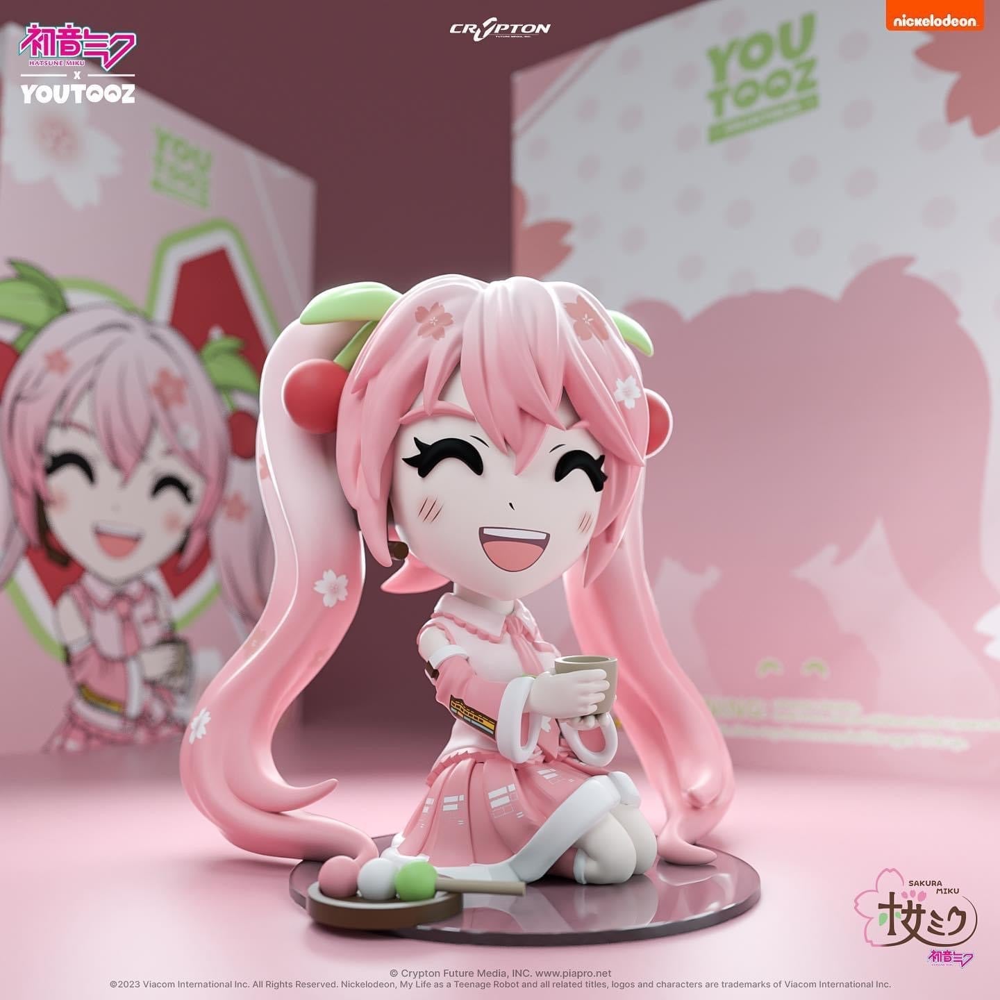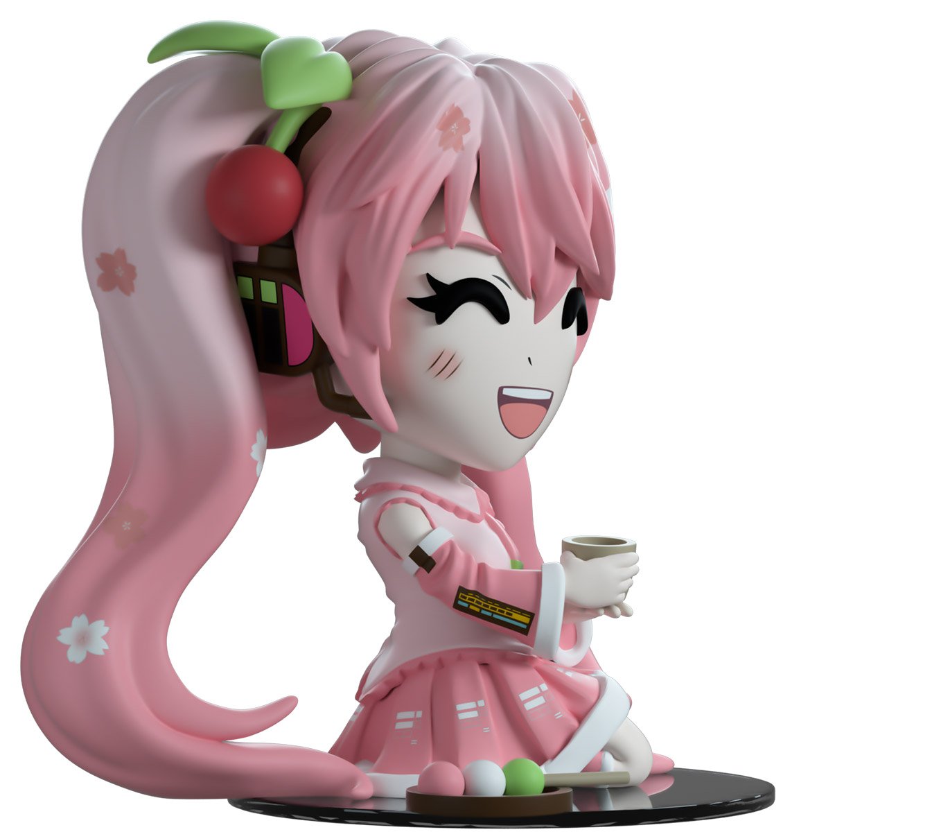 Miku is making her return to Youtooz in preparation for the cherry blossom season! Kneeling at 3.6 inches tall and holding a steaming cup of tea in both hands, she replaced her usual gray and blue outfit with the cutest frilly pink with thick white trim. Her long pink hair is adorned with delicate sakura flowers and falls on either side of her head in thick braids to rest at her side, perfectly framing her delighted blushing face. While the brown headpiece that sits atop her hair is adorned with vibrant red and green cherries, a delicious trio of mochi balls sit on the plate beside her. The exterior of its packaging is pale pink with polka dots and cherry blossoms that frame Miku's silhouette which extends to the interior completely surrounding her figure. The protective sheath is pink and white with wavy green bars running through it. This collectible comes in a matte, embossed, protective outer sleeve and a custom-sized plastic protector for maximum protection during shipping.