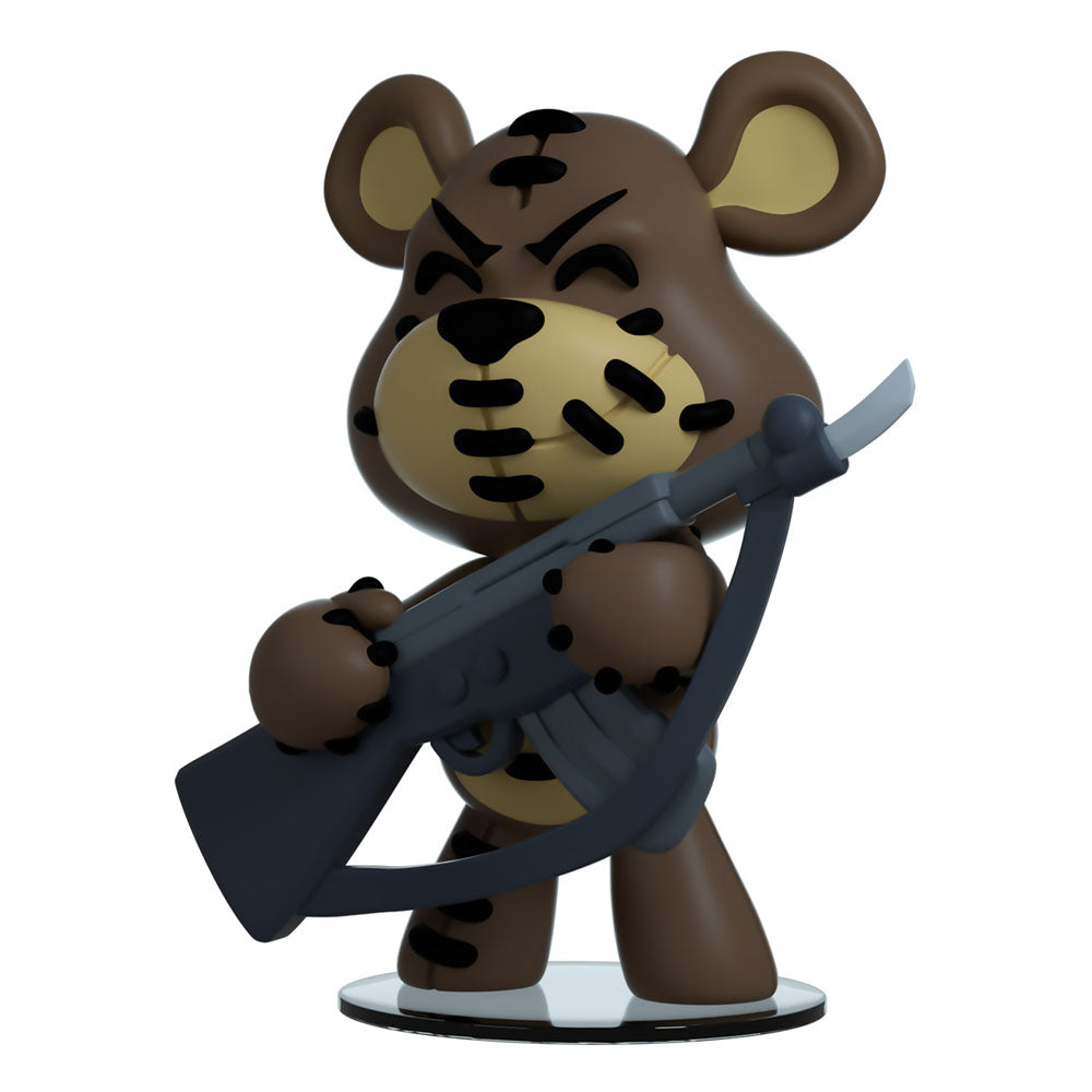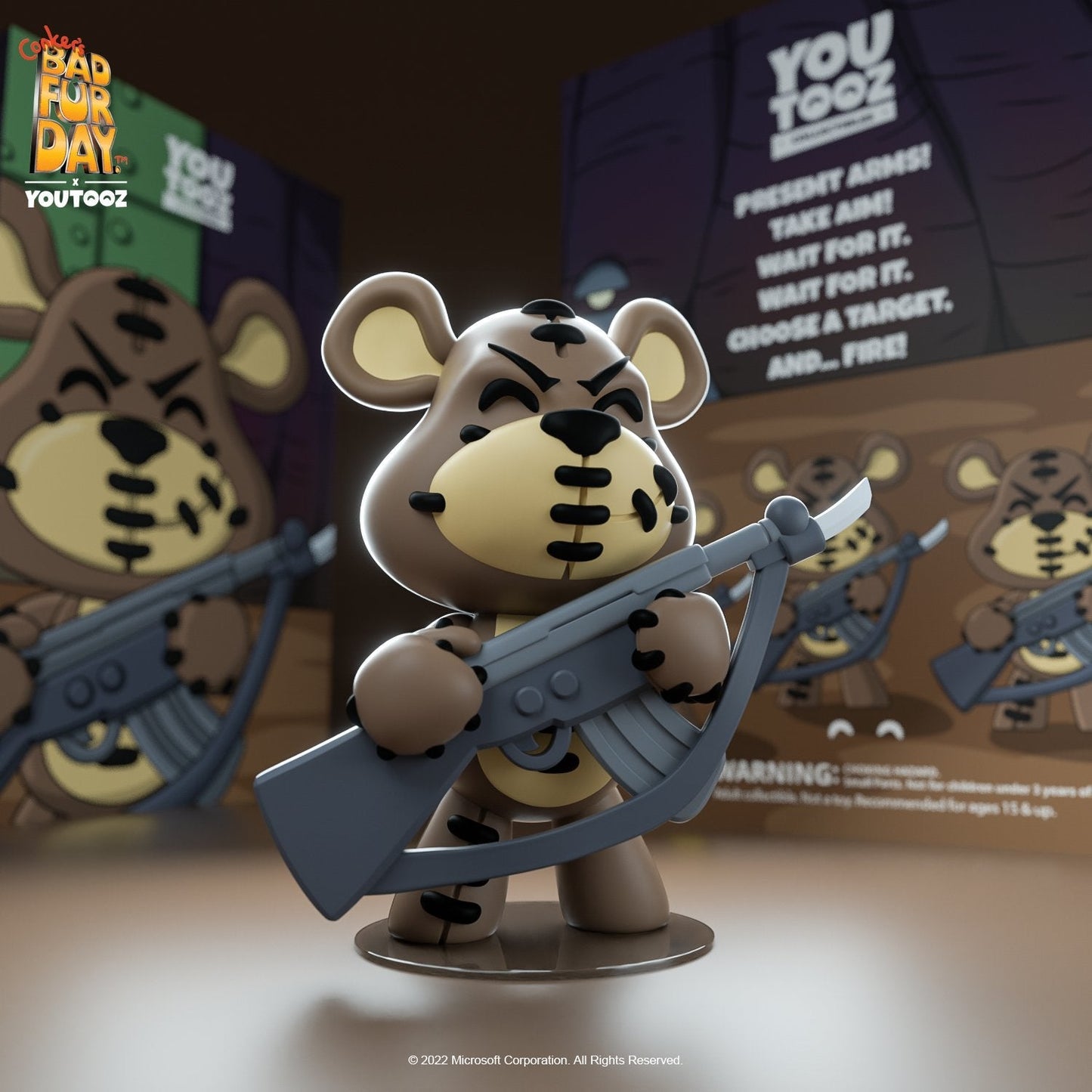 Kriplespac sent his vast legion of Tediz to the assault of YouTooz! 4.5 inches in height, the vicious robotic infantry is preparing for combat with a diabolical half-sourire and angular eyebrows frowning between its round ears (a little cute?). His two -tone brown body is held by many thick black seams hiding his interior in cold metal while he brandishes a large tight gray assault rifle in his legs, the bayonet at its perfect end to shoot down the unlucky members of the SHC. The exterior of his packaging sees Conker sneak in front of a Trio of Tediz En Marche in a military bunker. While the interior is a light brown degraded to black with the Conker's Bad Fur Day logo. The protective sheath sees rays of light shine on solid brown stone walls lit by fiery red torches. This collector's object is delivered in a matt, embossed and protective exterior sleeve and a personalized size plastic protector for maximum protection during shipping.