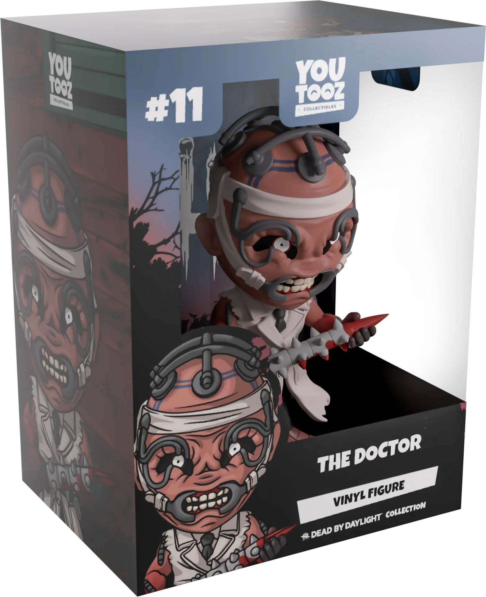 Ready for surgery? Well, the Doctor is here and he's ready to cut even if you're not! Standing, primed and ready at 4.6 inches tall, the Doctor holds his bloody spike menacingly in both hands as he's dressed in black trousers, a brown jacket and a long, tattered white coat that's torn at the sleeves and cinched at the waist with a black belt. With his gnarled face contorted into an involuntary snarl, the metal device attached to his head pulls his mouth and eyes open. The window display box has been designed to feature the Doctor standing behind a door opening to welcome you into his office. While the interior is a black silhouetted forest with glowing red and blue mist and the white 'Dead by Daylight' logo on the back, this sinister design is then continued on the protective sleeve with dark trees completely surrounding him as their silhouette can be seen through the large clear window on the front. This collectible comes in a protective matte, embossed outer sleeve and a custom-sized plastic protector for maximum protection during shipping.