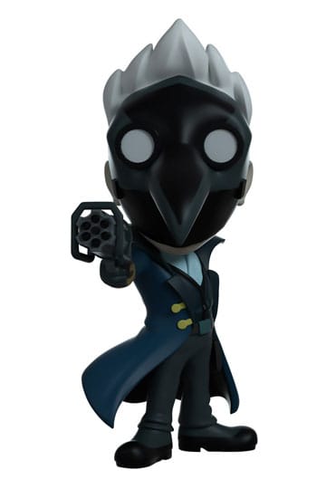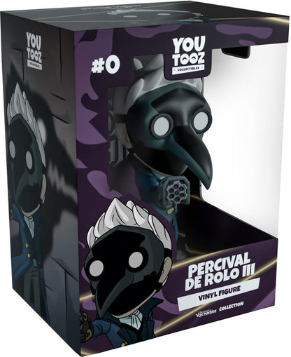 Percival Fredrickstein von Musel Klossowski from Rolo III , or more simply known as Percival from Rolo and or Percy made his way into his own Youtooz. Percy stands 5 inches tall, with his weapon cocked and ready in his right hand. He was made to wear his notable plague doctor mask covering his face, his classic and fashionable blue trench coat over his dapper pants and sweater. The glass display case was illustrated to show a backlit silhouette of Percy wearing the Plague Doctor's mask in front of a prison cell in a dark gray stone room. The inside of the box has been illustrated with The Legend of Vox Machina logo on top of a view of the continent as strings of golden light dance across it. Illustrated on the slipcover shows the silhouettes of all campaign members in front of a golden sunset.