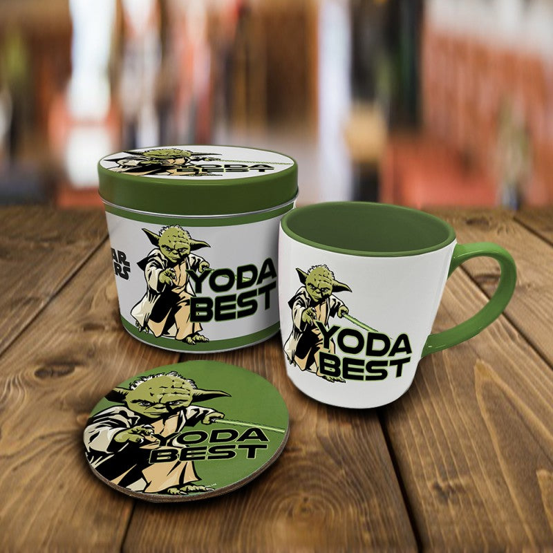UNE BOÎTE CADEAU AVEC MUG ET SOUS-VERRE POUR FANS DE YODA.