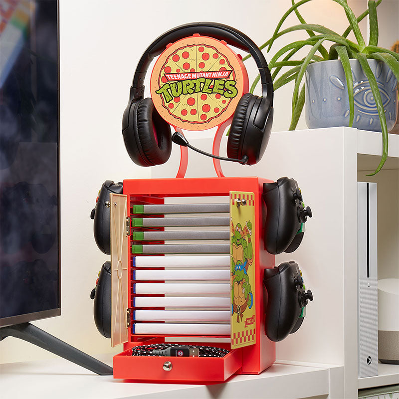 Gardez votre espace de jeu propre et bien rangé afin que vous ayez de la place pour votre pizza avec ce casier de jeu Teenage Mutant Ninja Turtles. Conçu avec un support sur le dessus pour vos écouteurs, il peut contenir jusqu'à 10 jeux Xbox One/Xbox Series X|S, jeux PS4/PS5 ou films et il y a un tiroir pratique pour d'autres éléments essentiels.
