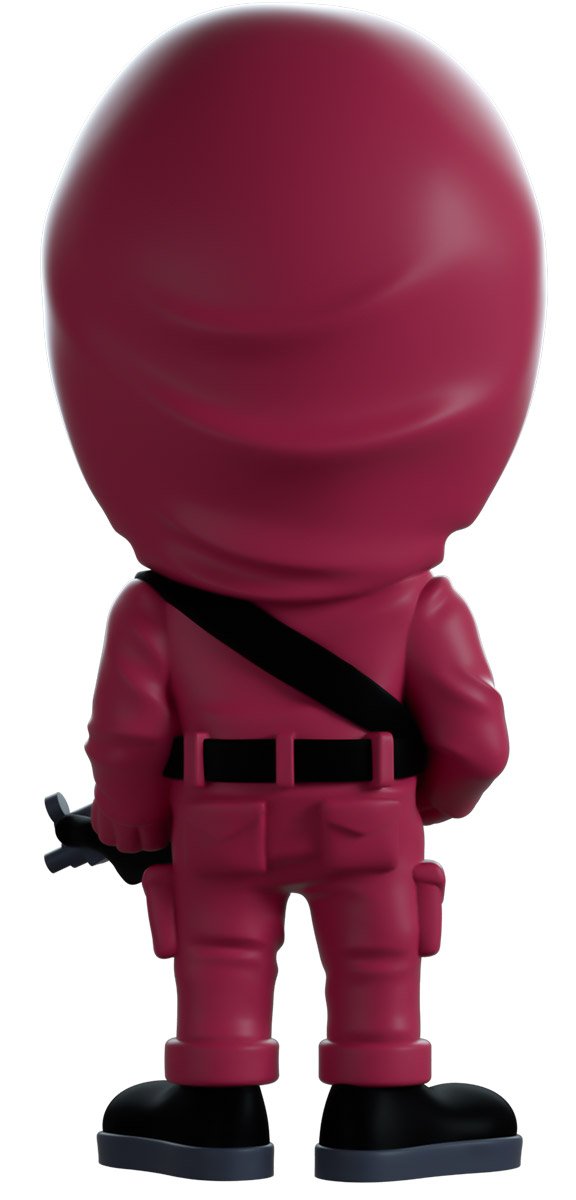 Le soldat masqué fait son débit Youtooz sans aucune intention sinistre… Debout à 4,5 pouces de hauteur, il tient une mitraillette grise à portée de main dans ses mains gantées noires alors qu'il porte une combinaison rose couverte de poches utilitaires. La capuche est relevée au-dessus de sa tête, ne laissant apparaître que son masque en maille noire, son devant a un placage en «T» en bas tandis que le haut est imprimé d'un grand triangle blanc. L'extérieur de son emballage le voit debout devant un groupe de soldats en combinaison rose debout en formation au sommet d'un escalier. L'intérieur est d'un noir profond et est chargé de symboles gris qui se répandent sur l'emballage protecteur qui a un arc rose qui le traverse, tandis que sa silhouette peut être vue à travers la grande fenêtre transparente à l'avant.