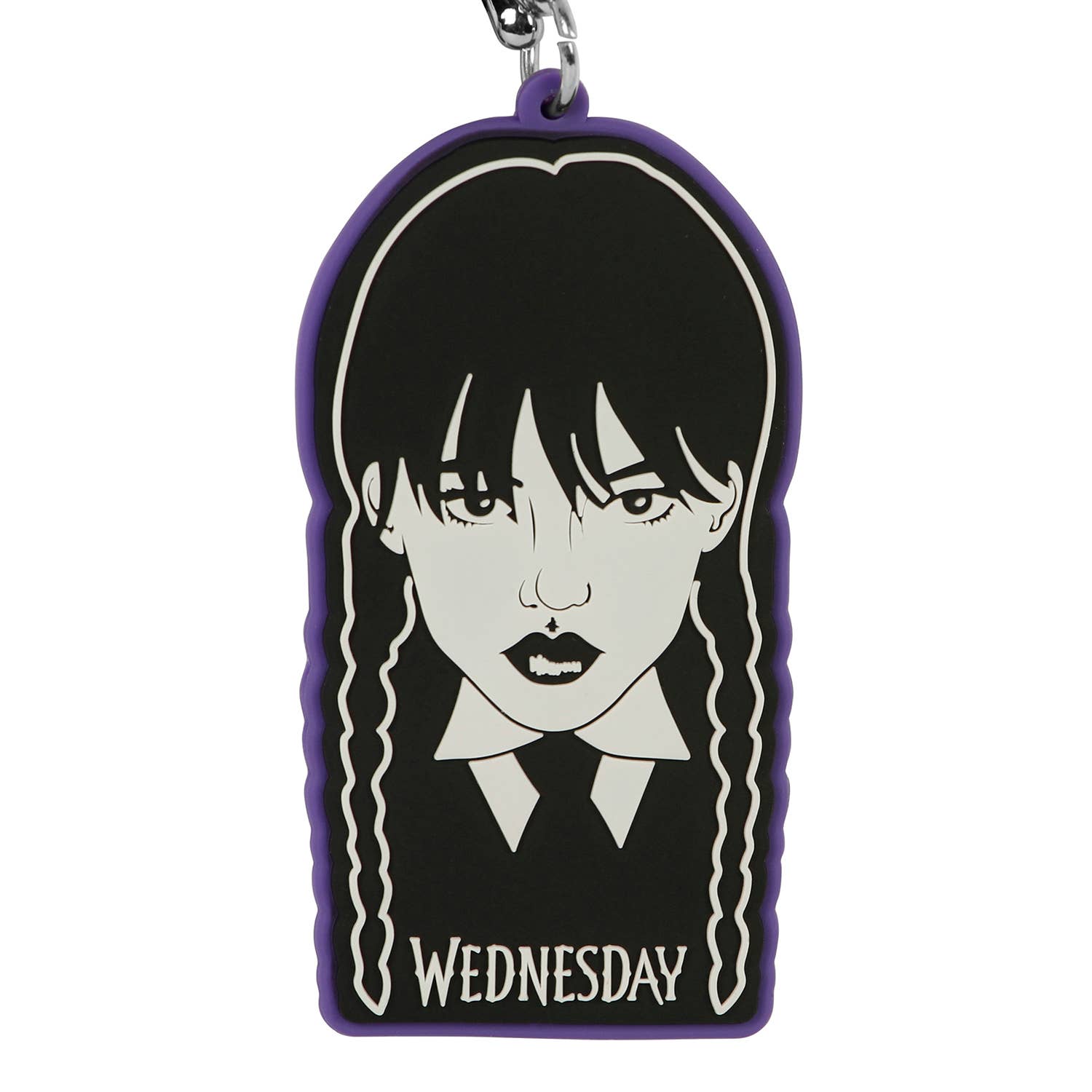 Porte-clés en PVC souple avec visage du Mercredi, à l'avant et à l'arrière. Comprend un anneau métallique et un crochet.