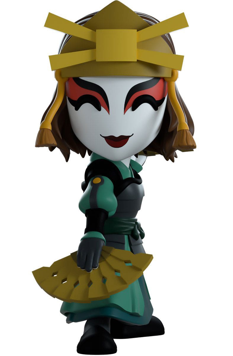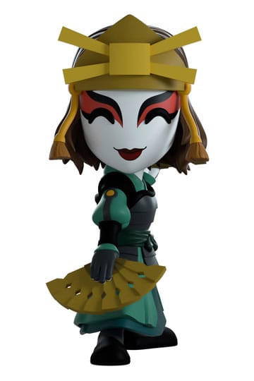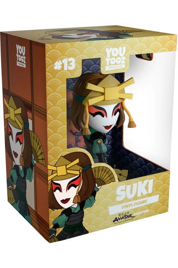 Toujours aussi féroce, Suki débarque sur Youtooz ! Debout à 4,4 pouces, elle a un sourire déterminé sur son visage. Elle est vêtue de l'uniforme du Royaume de la Terre qui consiste en une robe verte avec une armure noire sur le dessus. Elle est postée regardant par-dessus son épaule droite, la main droite posée vers le sol, tenant un éventail. Sa main gauche est pliée vers le haut derrière sa tête, tenant également un éventail. Autour de sa tête se trouve un casque en or qui est attaché à sa tête avec une sangle verte. L'extérieur de son emballage à double paroi montre Suki en plein entraînement. L'intérieur est la carte des 4 nations. Le manchon de protection est un dessin des 4 éléments.