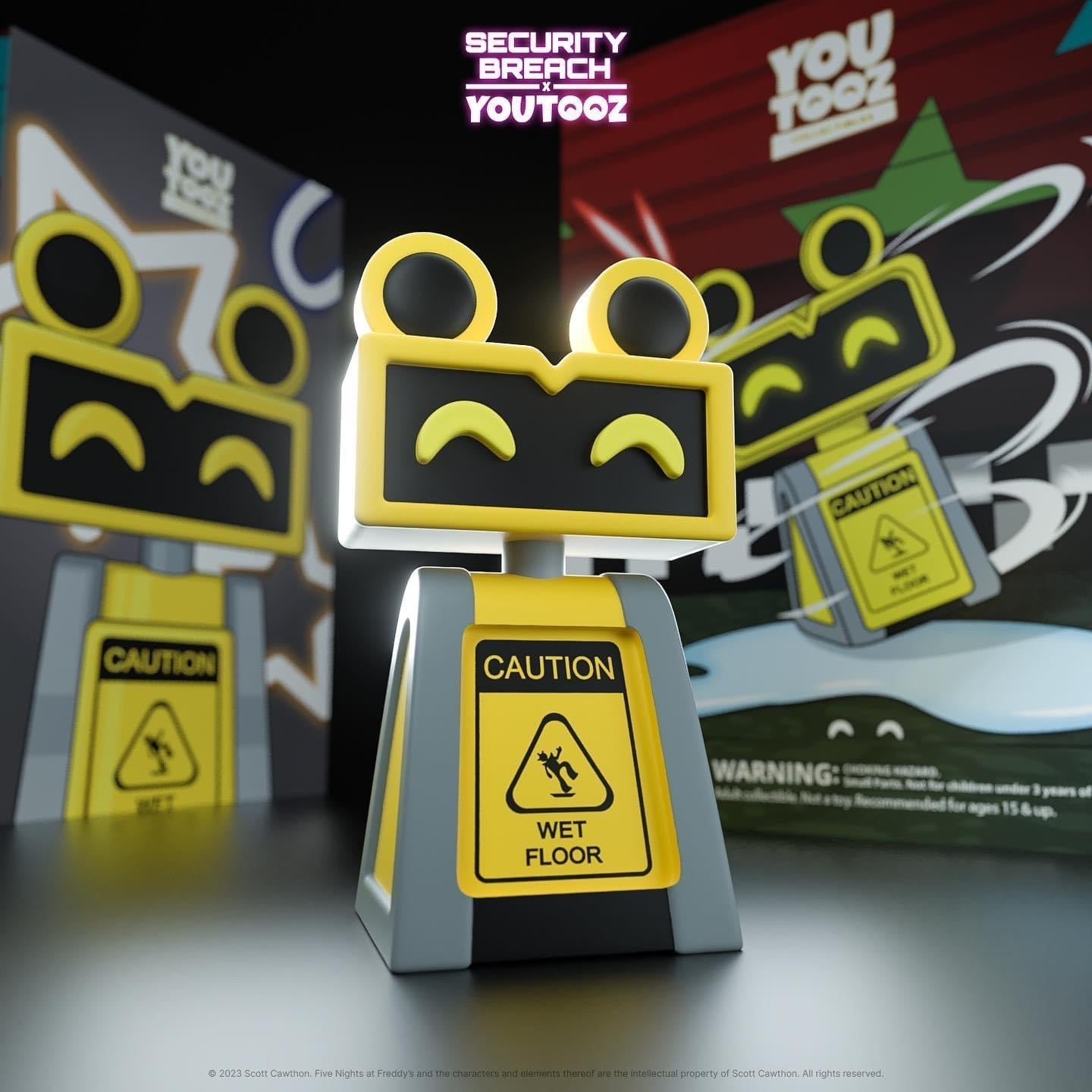 Le Wet Floor Bot est là pour vous avertir de ses débuts sur Youtooz ! À 3,7 pouces de hauteur, leur tête jaune rectangulaire plate est divisée en son centre en forme de V et renferme un écran noir foncé avec des yeux brillants tout en étant surmonté de grands cercles noirs et jaunes. Leur corps triangulaire parfaitement équilibré est construit avec des bandes de roulement gris clair de chaque côté pour une mobilité maximale, car son avant et son arrière vous avertissent d'un danger immédiat avec un panneau "Attention" fixé de chaque côté. L'extérieur de son emballage voit un Wet Floor Bot paniqué se retourner sur le déversement le plus glissant ! Alors que l'intérieur montre un moniteur de sécurité installé affichant Freddy, Chica, Monty et Roxy à travers les écrans tandis que le Wet Floor Bot se profile dans l'obscurité à ses côtés.
